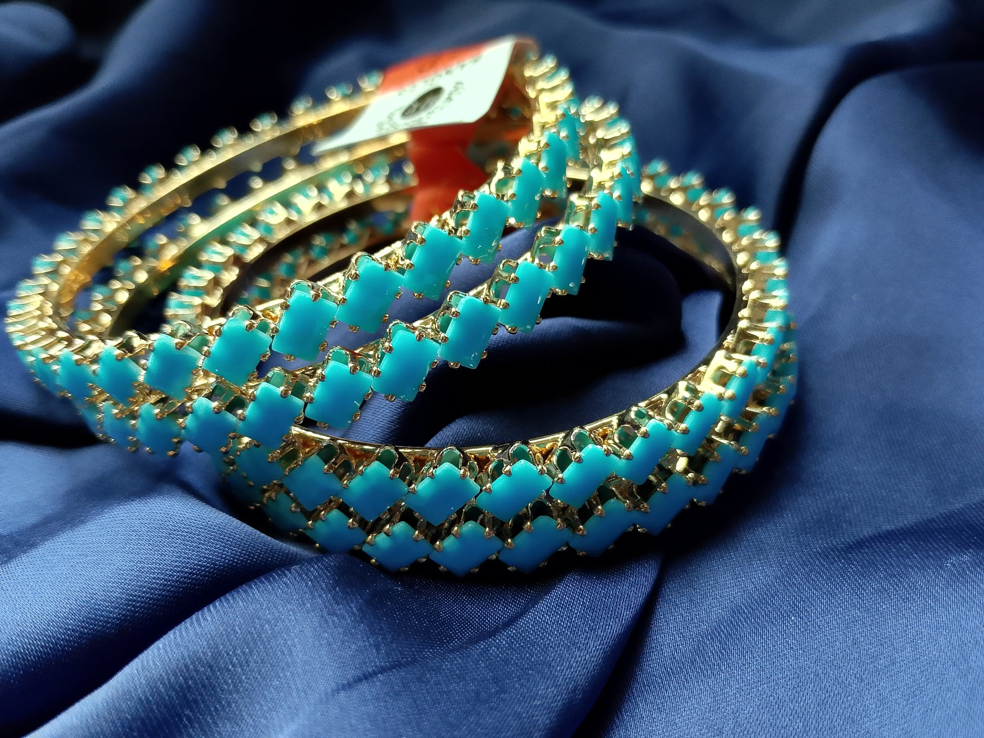These beautiful bangles feature a bold, studded zigzag pattern in vibrant turquoise and rich gold tone. The full-circle design ensures maximum visual interest from every angle. Get the luxurious, confident look and ReBrand your accessories effortlessly.