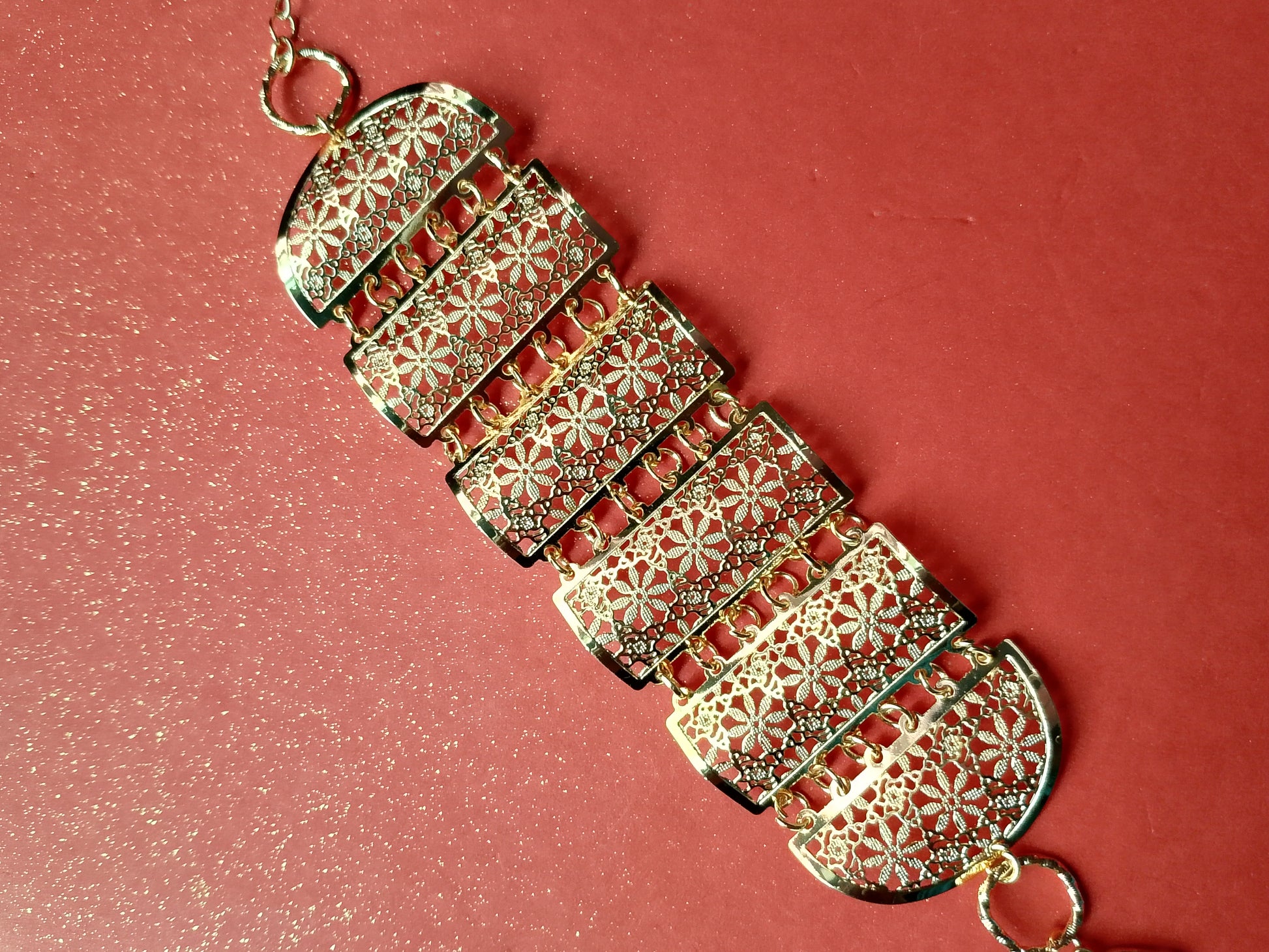 This beautifully crafted bracelet features a series of gold-toned panels adorned with delicate floral cut-out patterns. Its bold yet elegant design makes it a perfect accessory for special occasions, parties, or casual wear. Lightweight and stylish, this bracelet adds a touch of traditional charm with a modern twist.