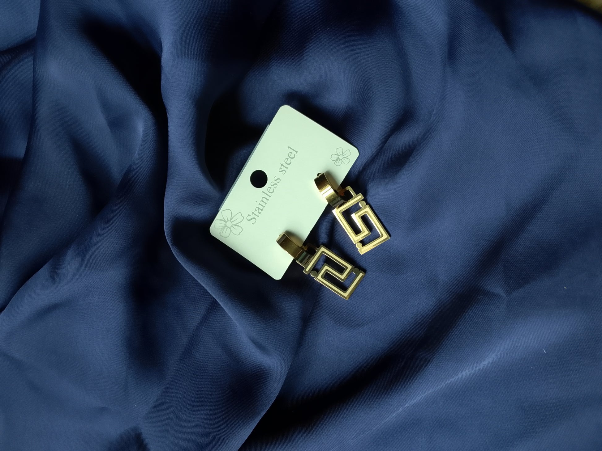 The design features a sleek, rectangular drop with a captivating maze or labyrinth-inspired pattern in the center. The bold, modern lines offer an art-deco feel and provide fantastic movement. Perfect for adding an architectural edge to your professional attire or an avant-garde touch to your weekend look. They're a lightweight accessory that delivers maximum impact.